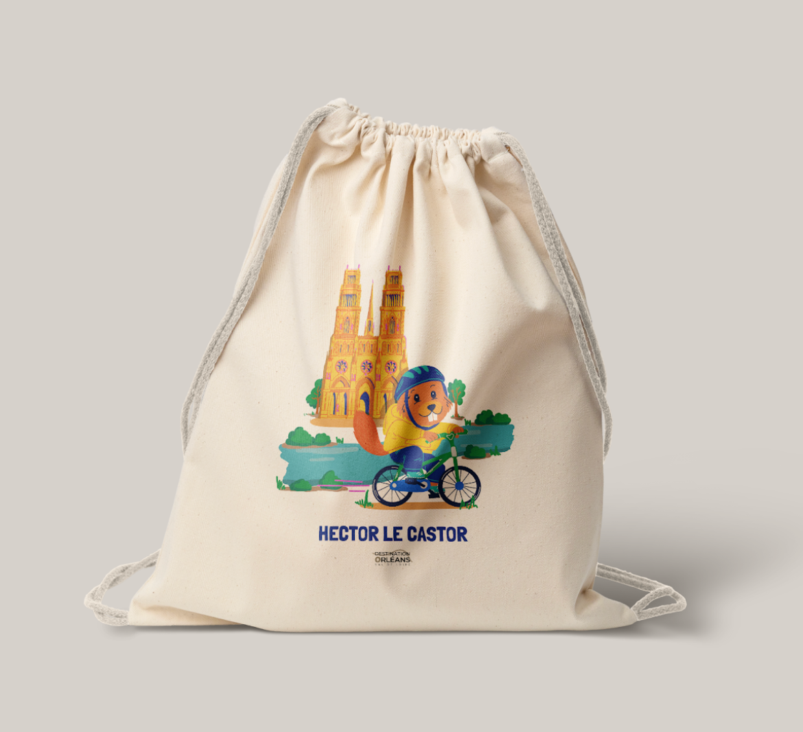 Gamme de souvenirs ludiques et pédagogiques pour séduire les familles en visite à Orléans. Illustrations colorées célébrant le patrimoine orléanais (la cathédrale, Hector le castor, la Loire...) déclinées sur carnets d'activités, tote bags, tee-shirt, carnets..